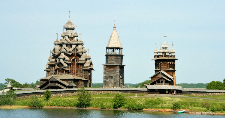 Kizhi Pogost is a historical site located on Kizhi Island, Russia. The site dates back to the 17th century and is an excellent example of the Russian carpentry of that era. The island is located in the Republic of Karelia on Lake Onega. The Kizhi Pogost refers to an area that is located within a fence on the island. Inside the fence lies two wooden churches and a bell tower.